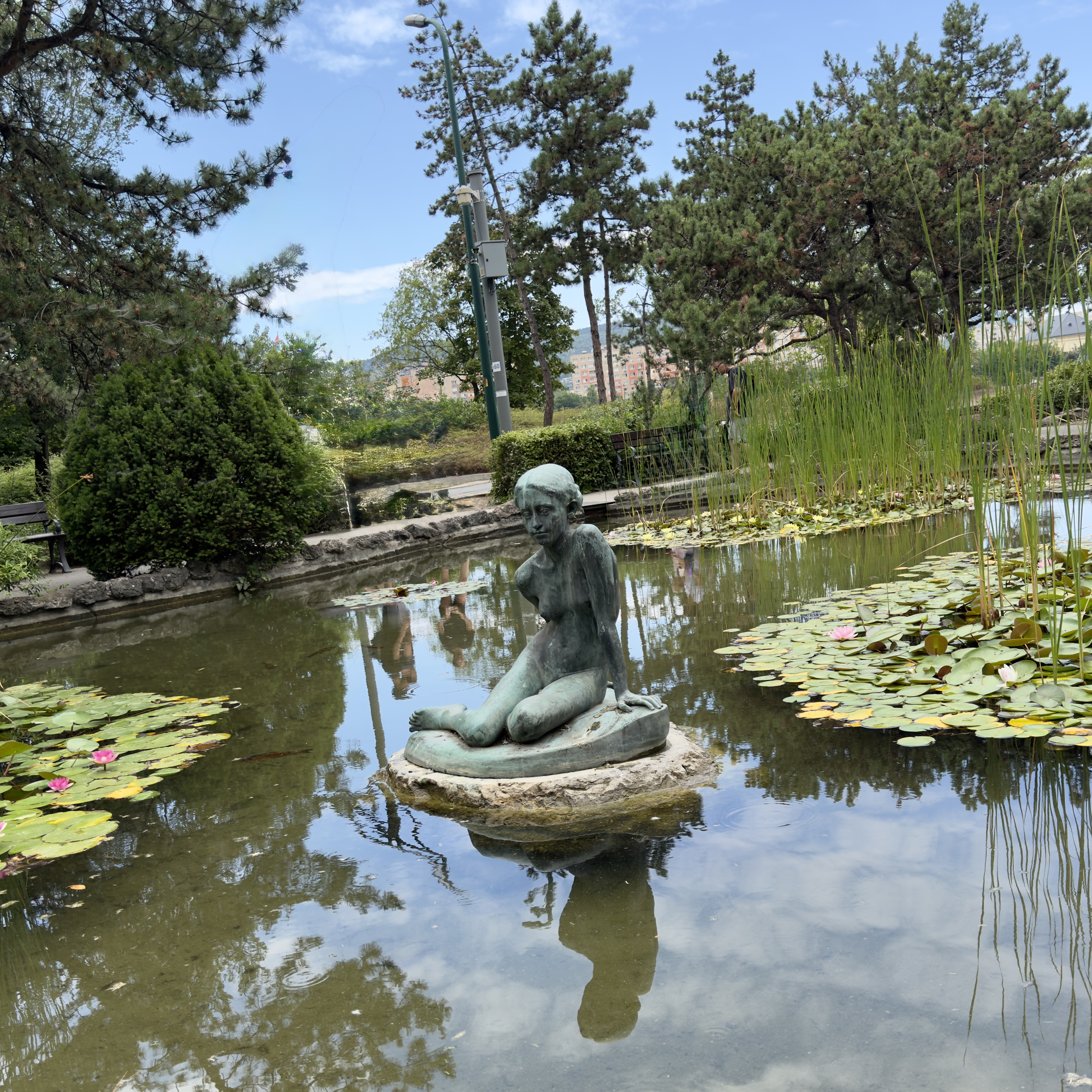 It was a bit cooler today with some cloud cover so we set off to explore Margaret Island. Margaret Island is Budapest’s biggest green oasis. We took the tram then walked across the yellow Margaret Bridge and were into the lush green of the park. The whole island is a huge park, home to the ruin of a medieval convent, a lovely Japanese garden, a mini zoo, century-old towering trees and lots of flowing gardens. My favorite part of the park was the fountain that pulses to music, it was magical!!!