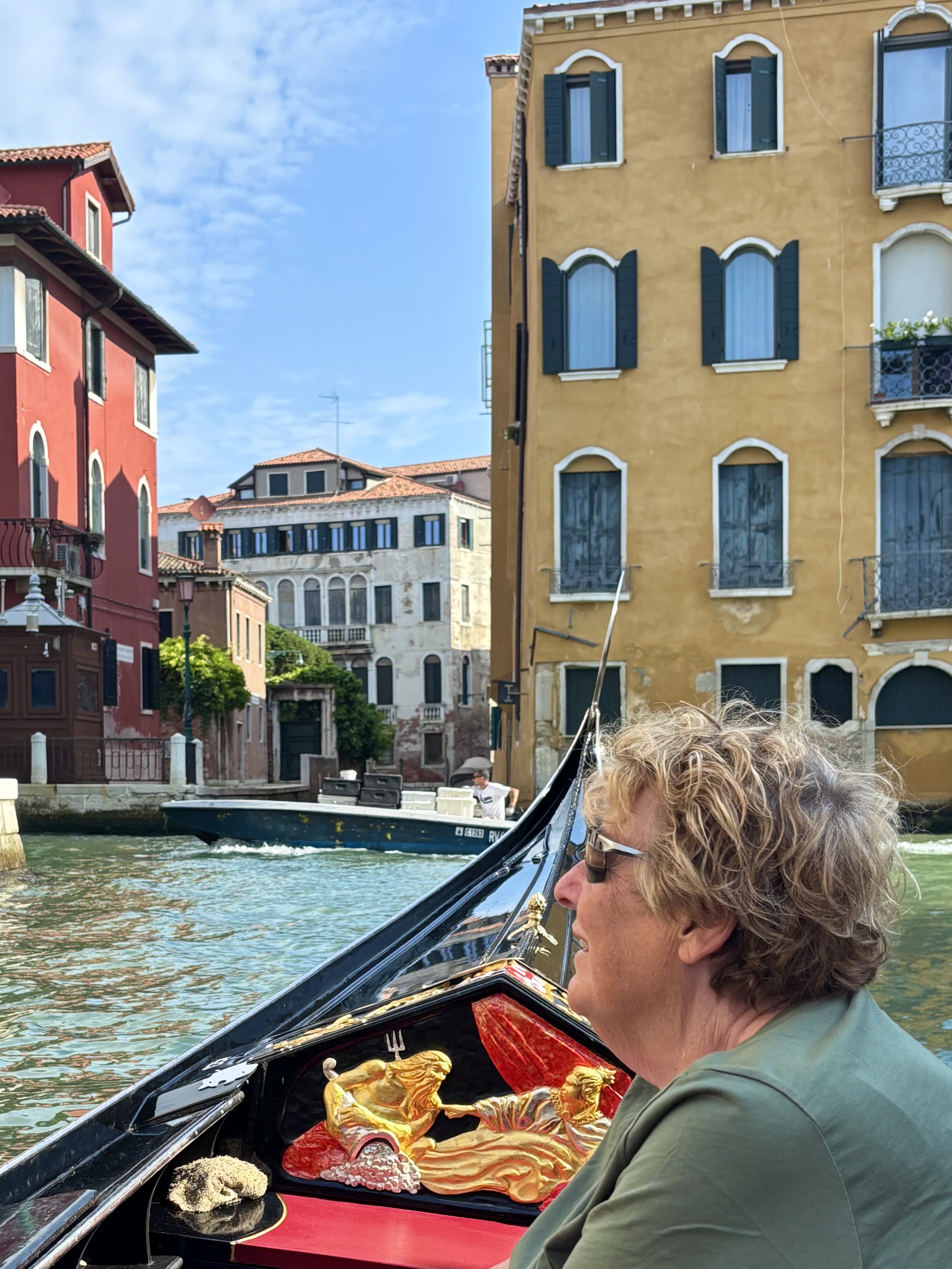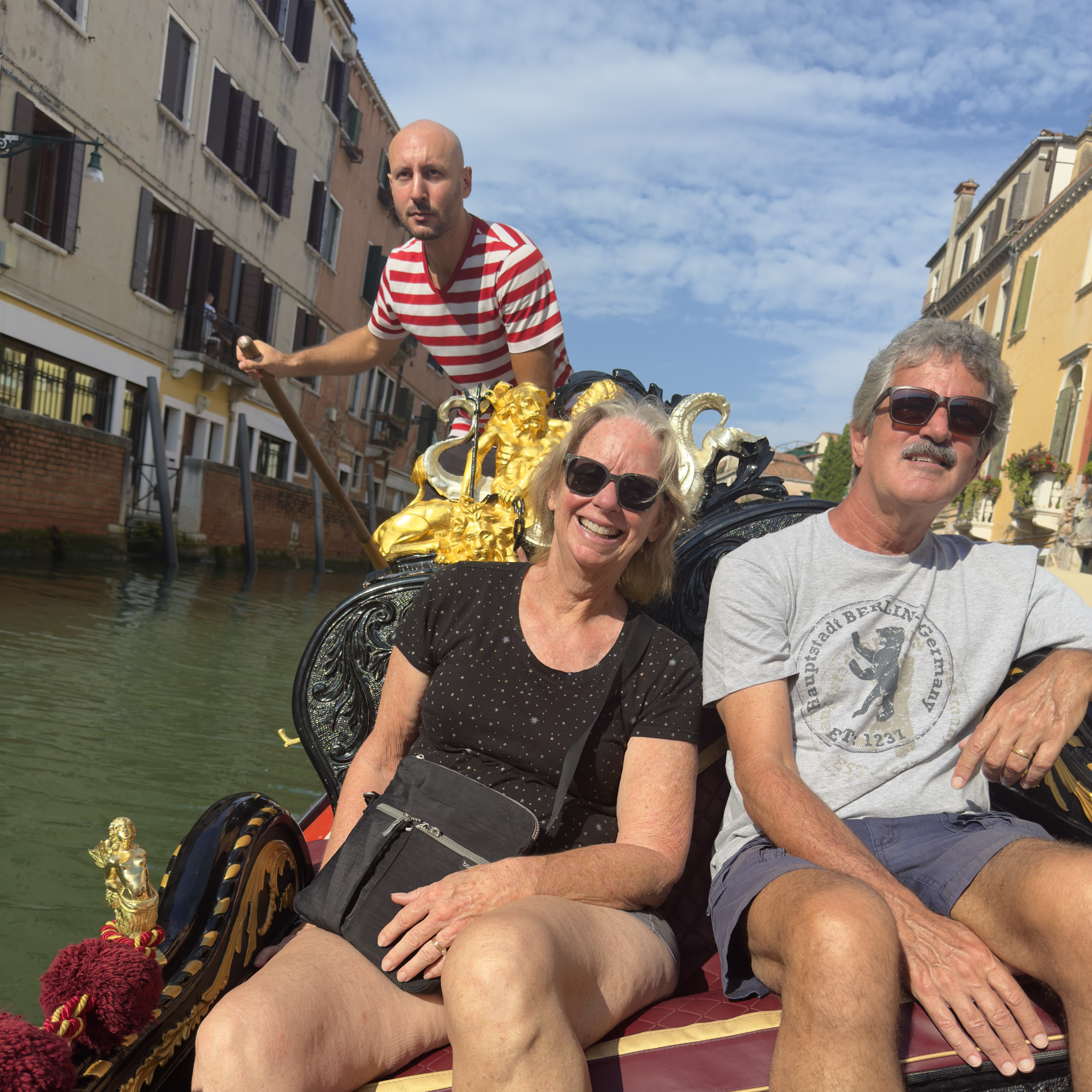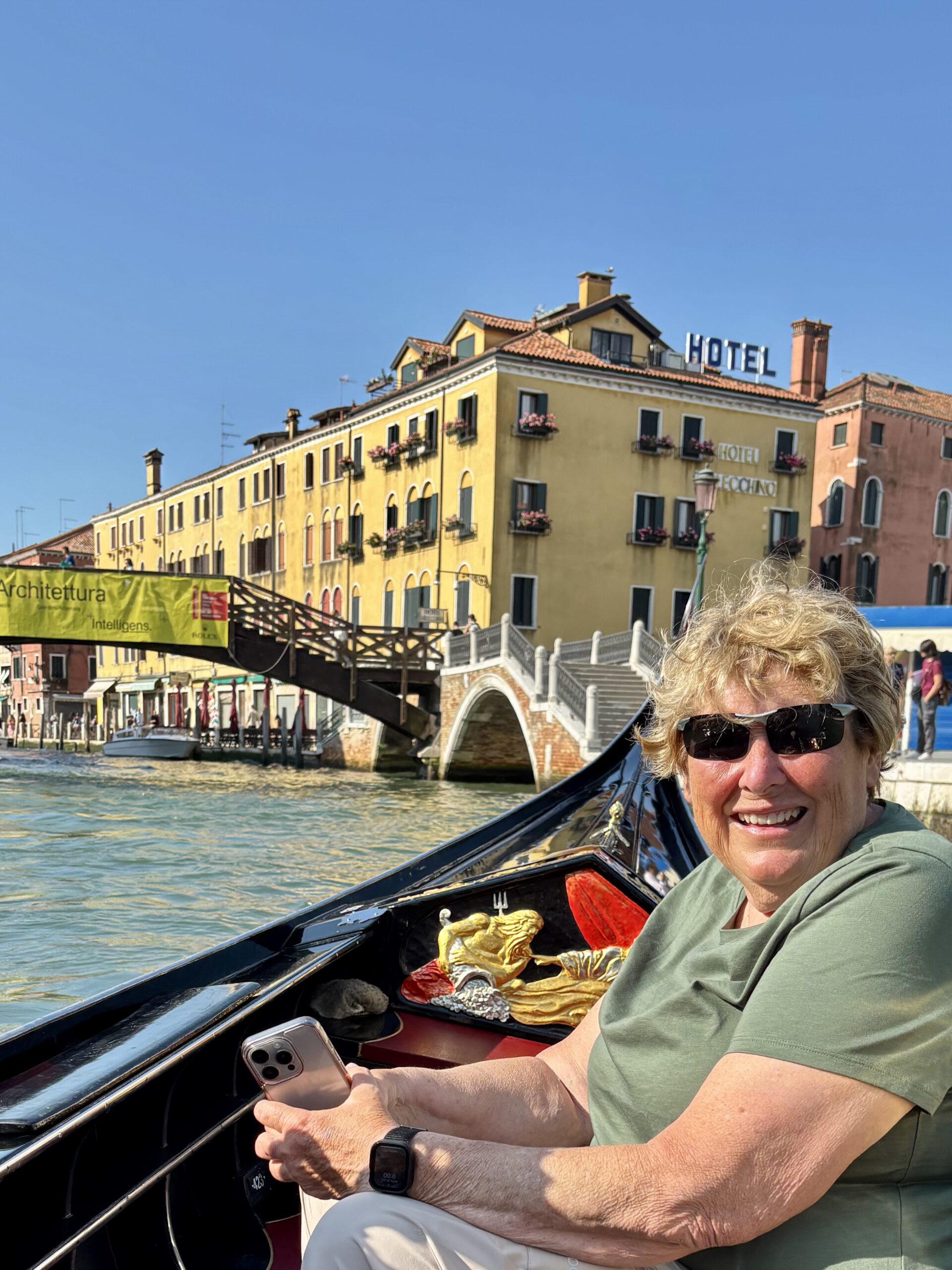 According to our guide yesterday, gondola rides are considered a tacky tourist thing but we did it anyway! I booked us on one that early one and one that went into the small canals so we would not be part of the gondola conga line. It was so much fun!!! At one point we had to tip the boat to the right to get under a bridge and Kim was a bit nervous about that bus she smiled though it….lol!!!!