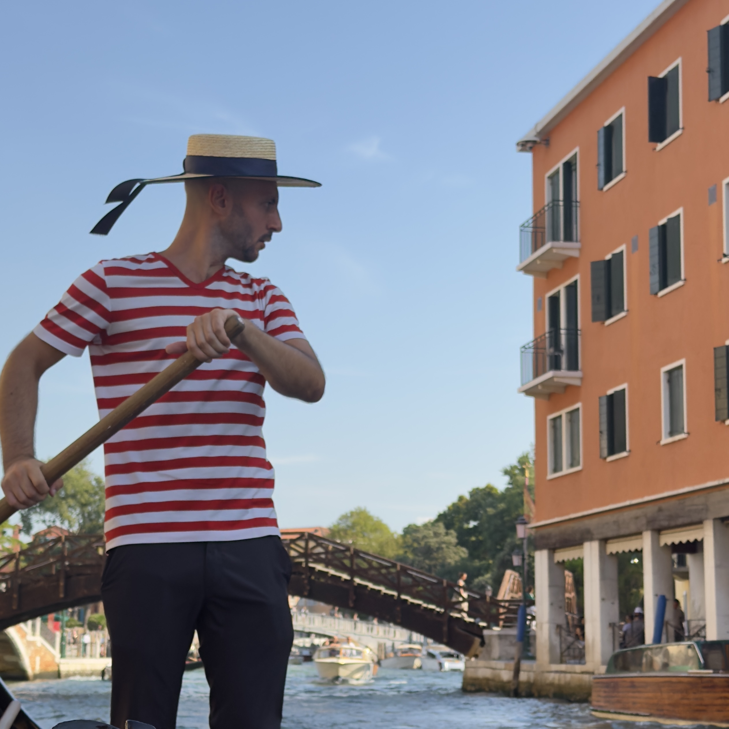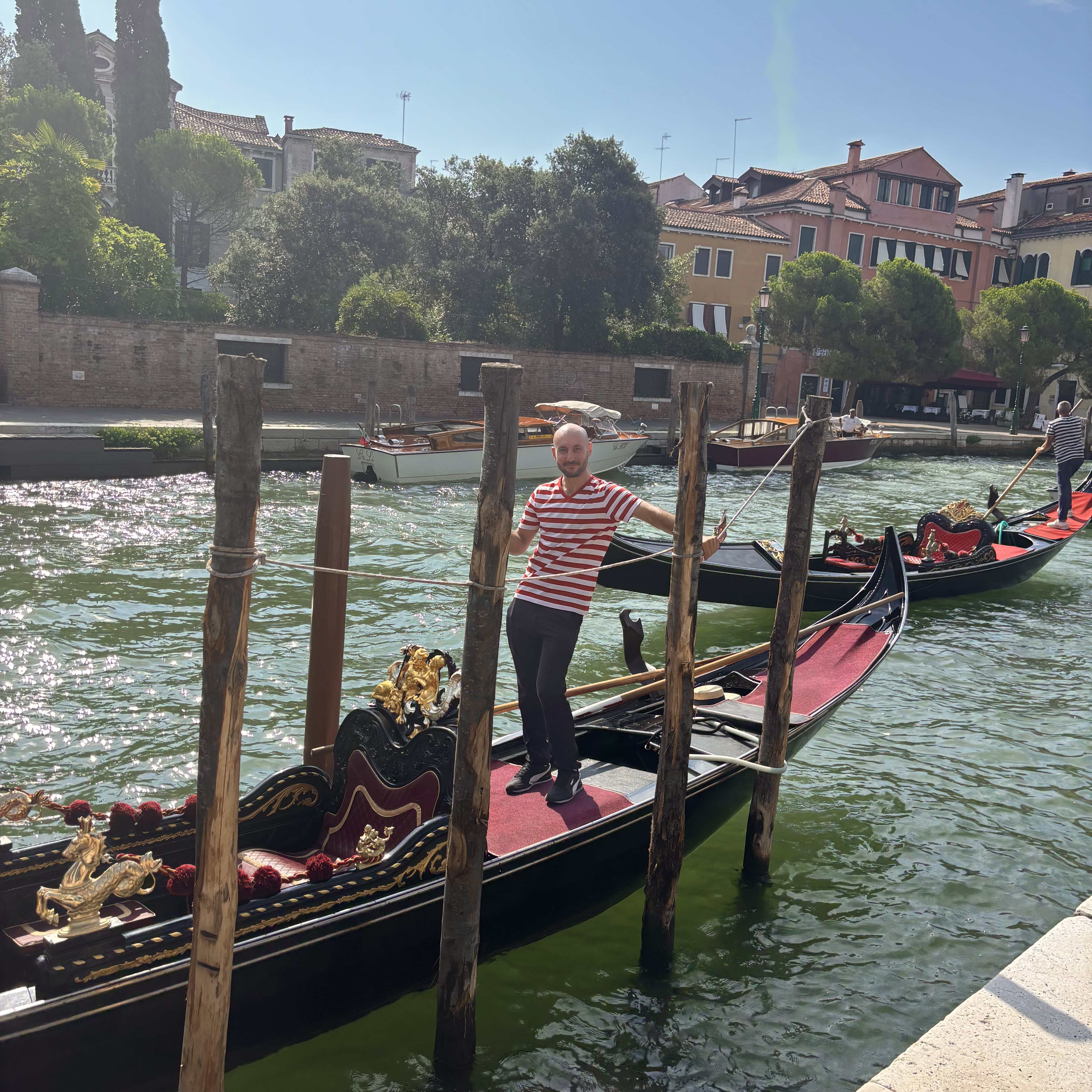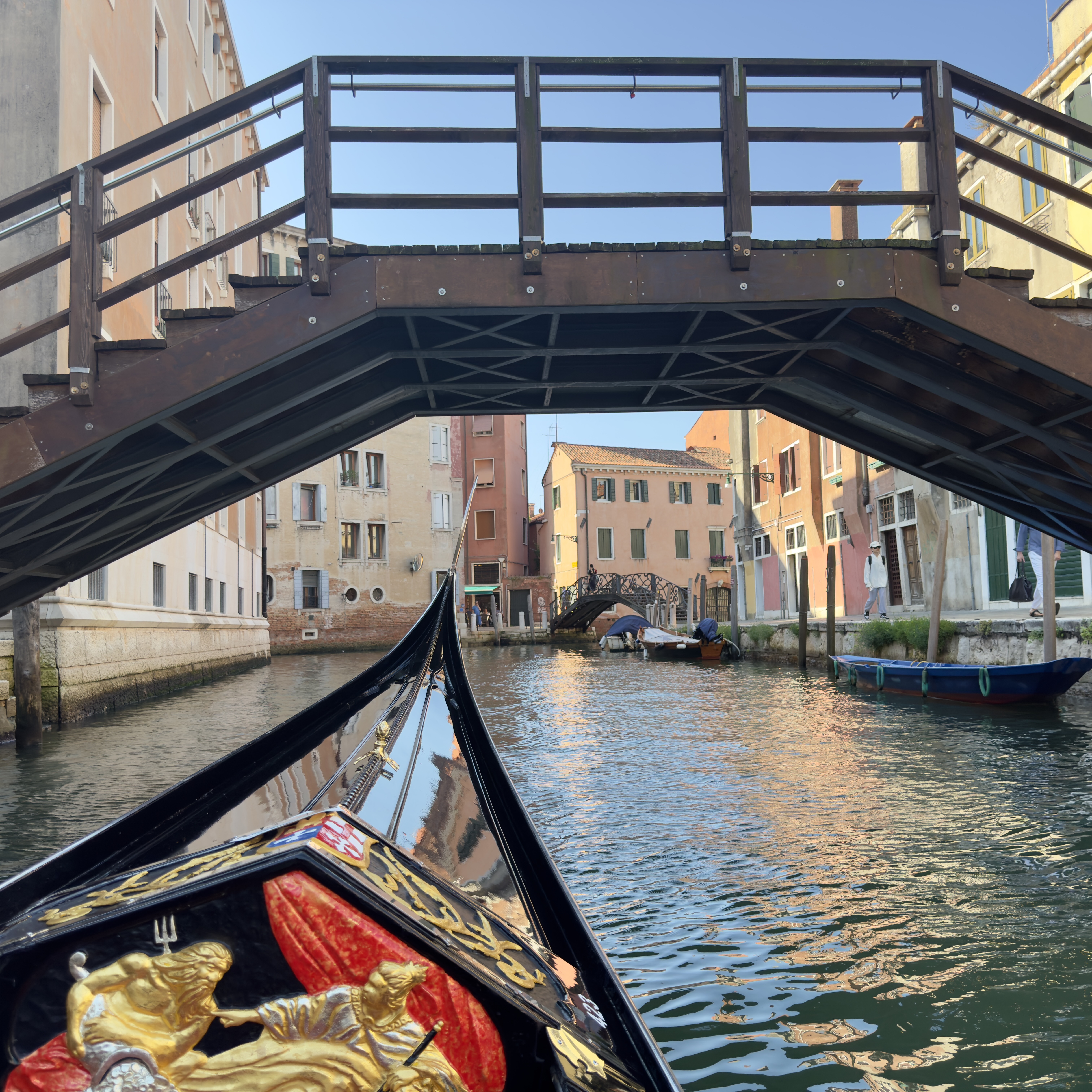 According to our guide yesterday, gondola rides are considered a tacky tourist thing but we did it anyway! I booked us on one that early one and one that went into the small canals so we would not be part of the gondola conga line. It was so much fun!!! At one point we had to tip the boat to the right to get under a bridge and Kim was a bit nervous about that bus she smiled though it….lol!!!!