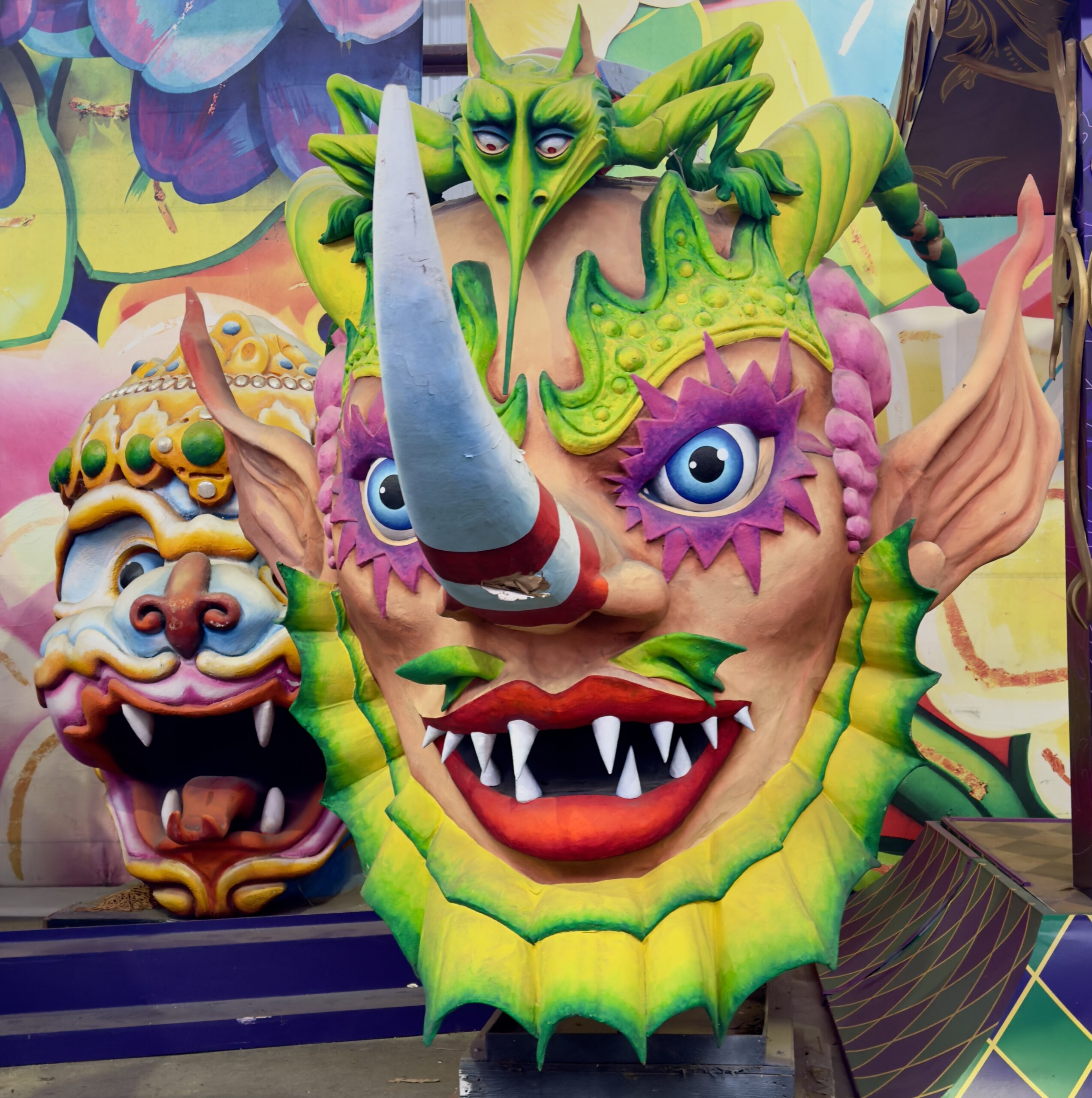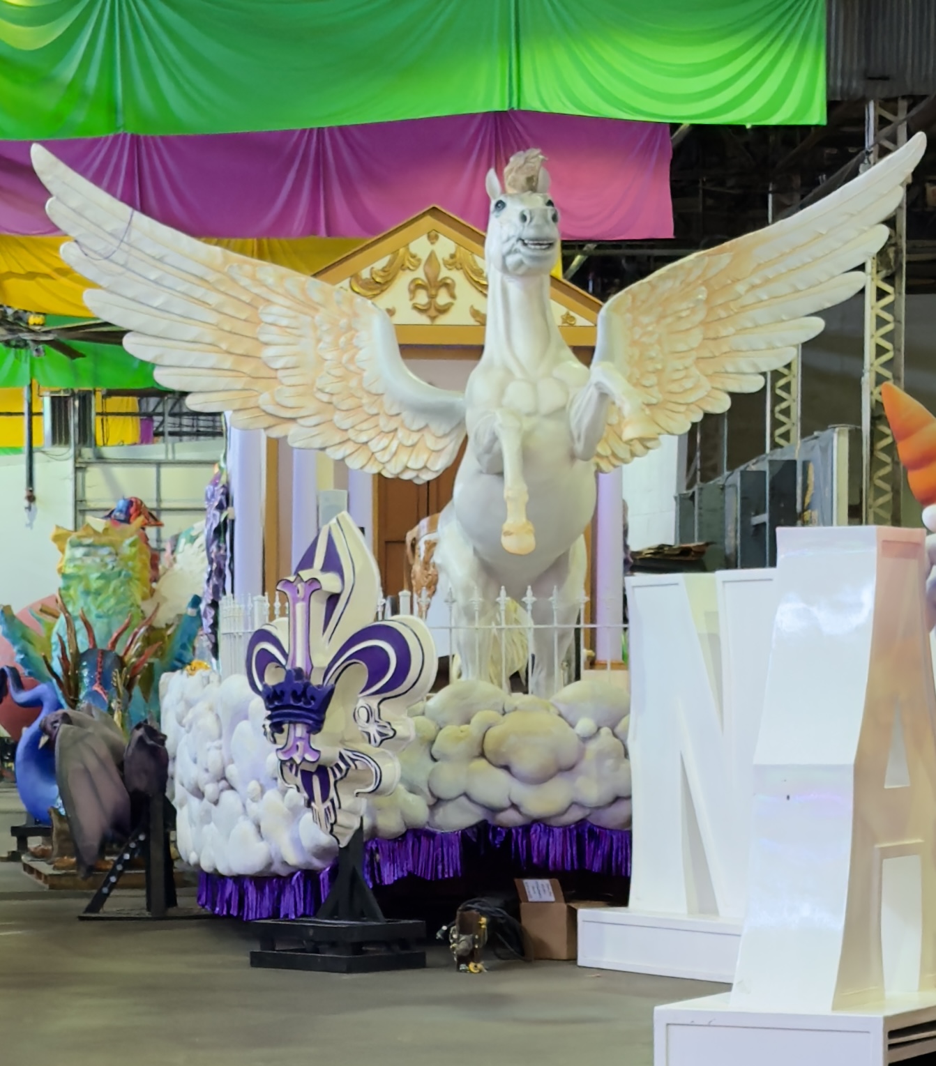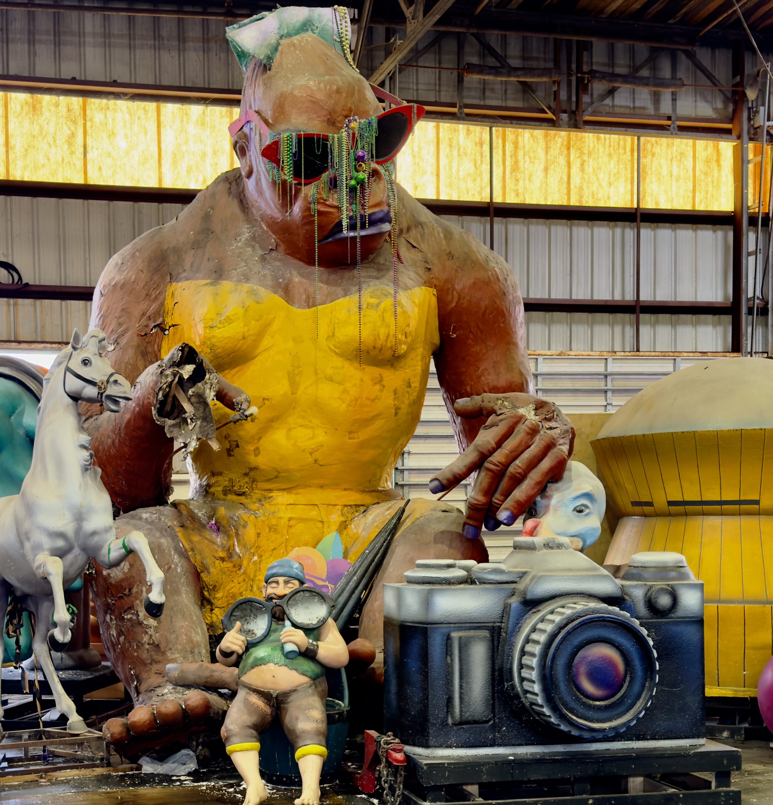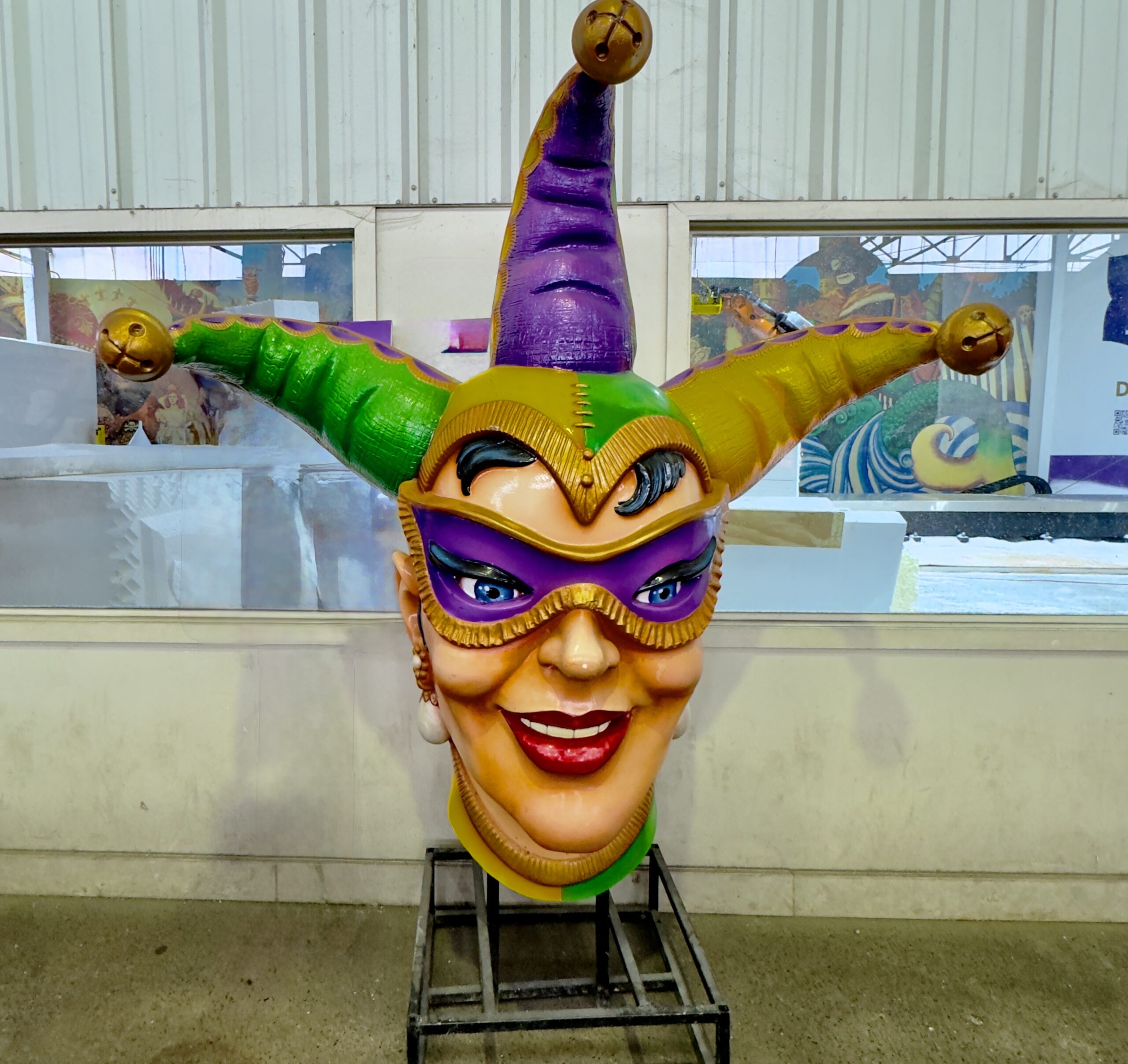 It has stopped raining and although it is still overcast it is time to go adventuring. We hopped on the ferry to head into the city with our first stop being Madi Gras World. This is where the floats for the Madi Gras parade are created and stored. The large statues that adorn the floats are created out of layers of styrofoam then a coat of brown paper mache is applied to smooth out the foam. Then they are painted. There is a laser cutter that creates mounds of white dust.