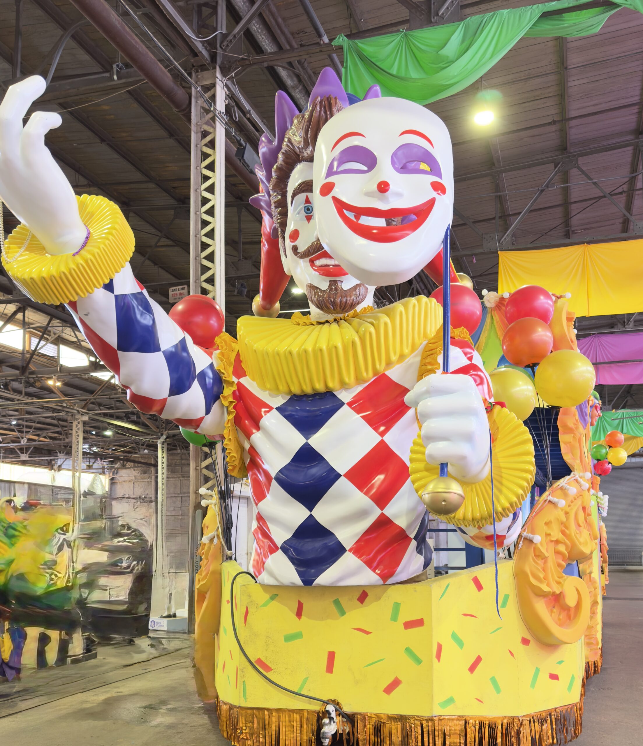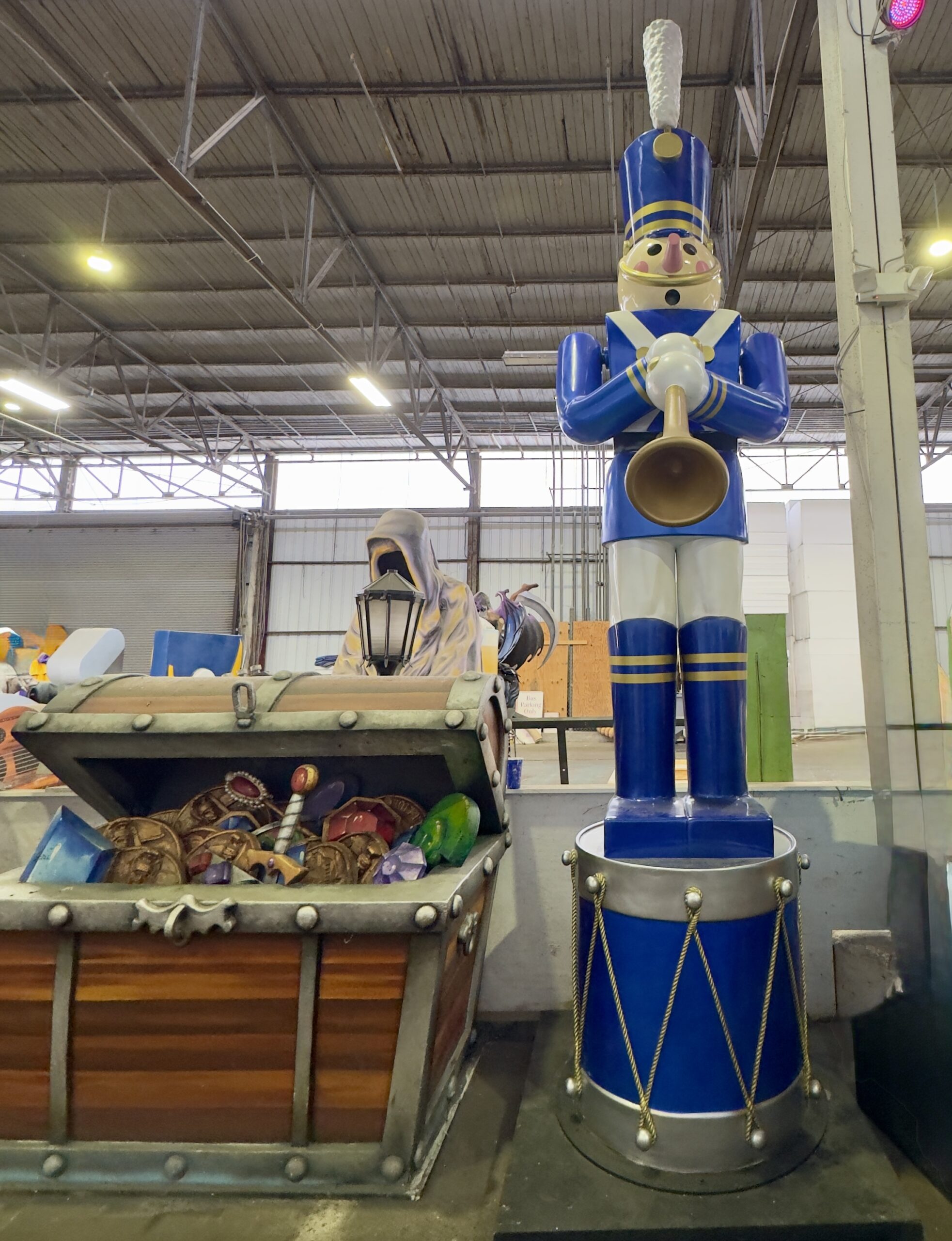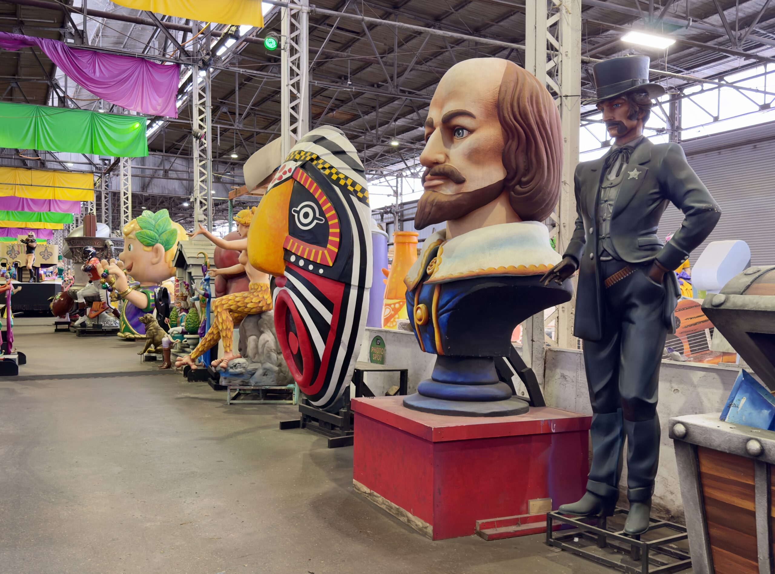 It has stopped raining and although it is still overcast it is time to go adventuring. We hopped on the ferry to head into the city with our first stop being Madi Gras World. This is where the floats for the Madi Gras parade are created and stored. The large statues that adorn the floats are created out of layers of styrofoam then a coat of brown paper mache is applied to smooth out the foam. Then they are painted. There is a laser cutter that creates mounds of white dust.