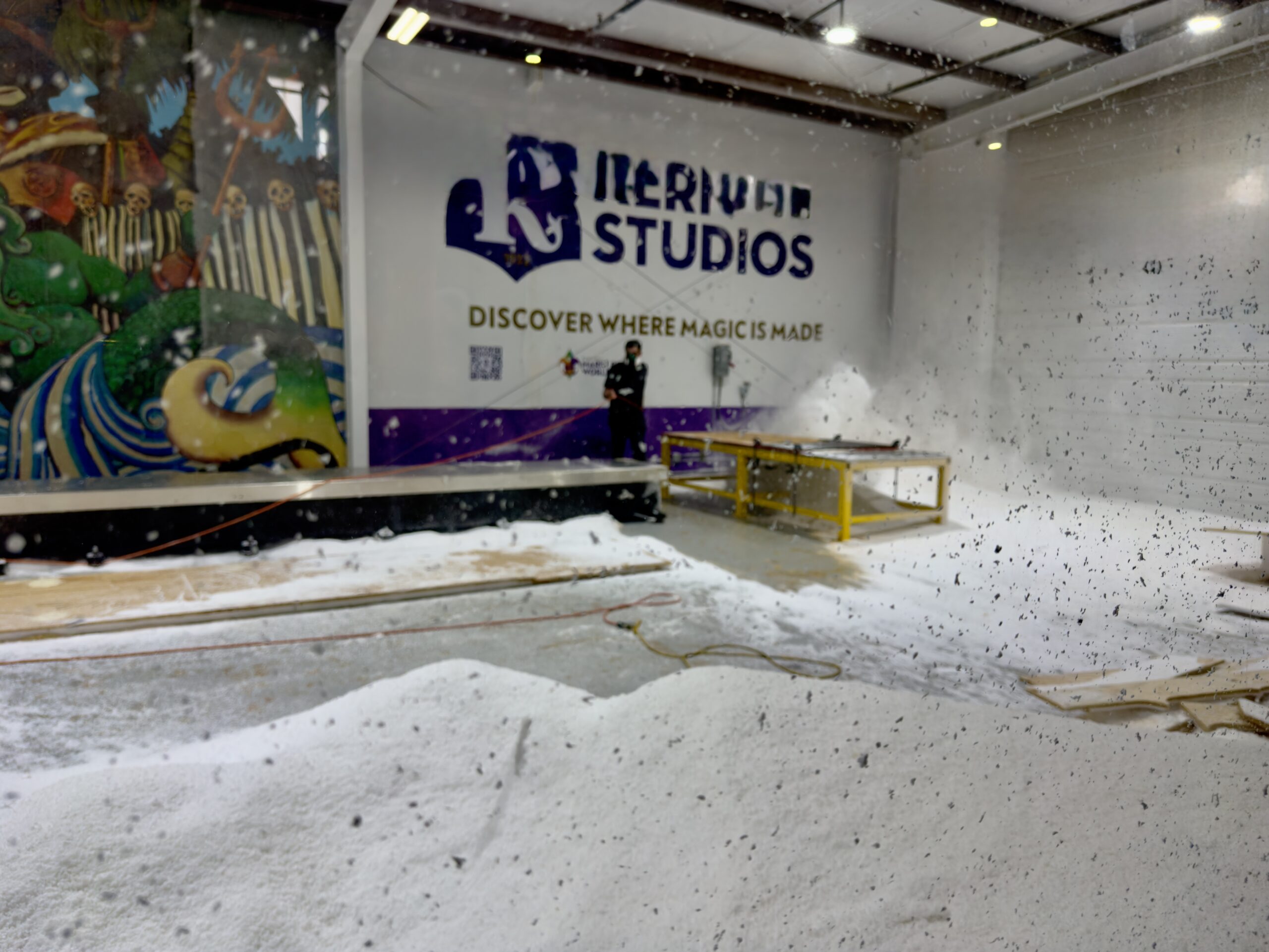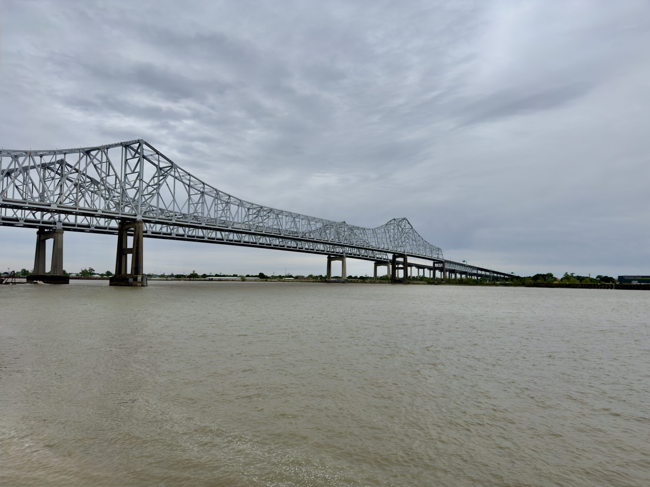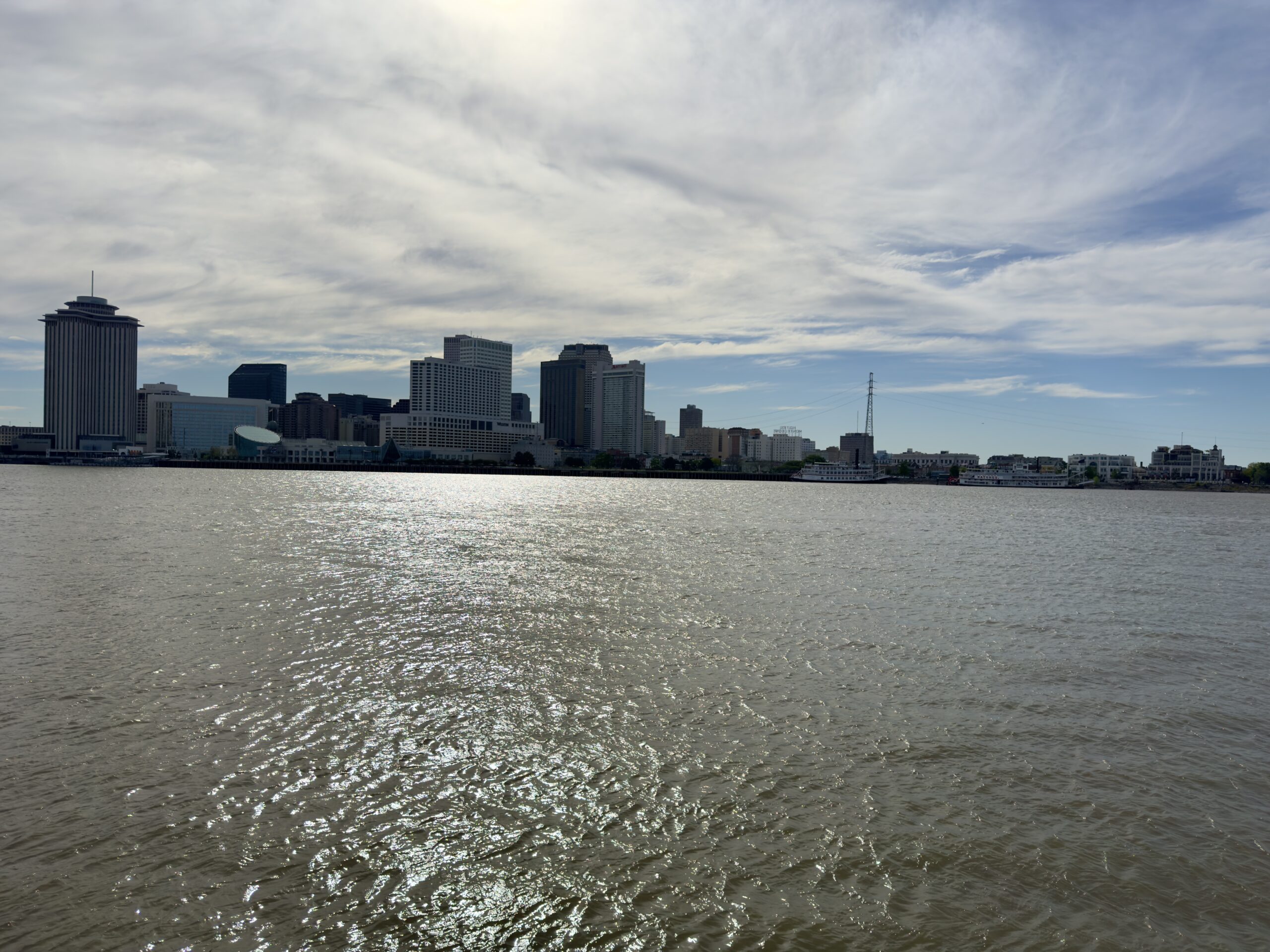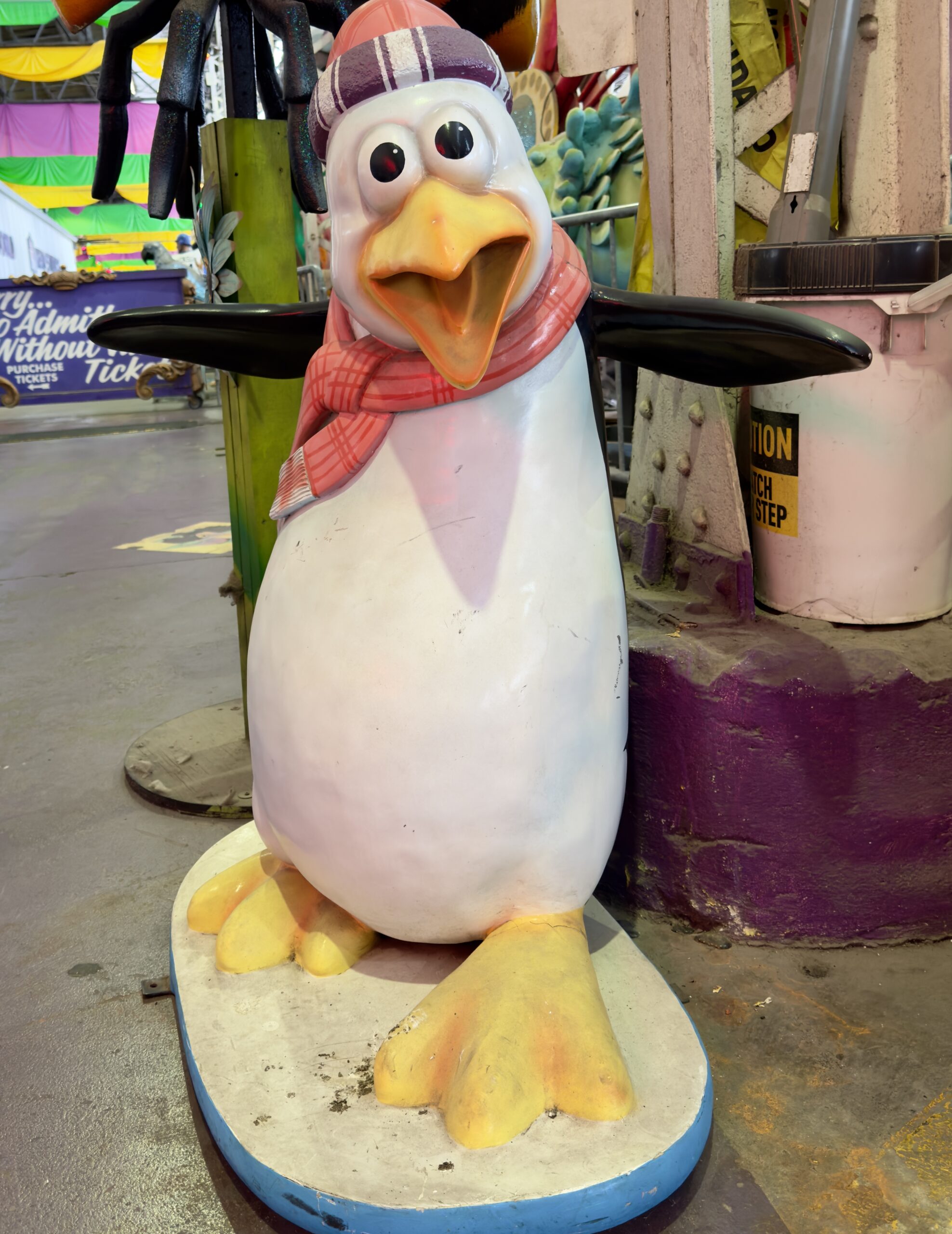 It has stopped raining and although it is still overcast it is time to go adventuring. We hopped on the ferry to head into the city with our first stop being Madi Gras World. This is where the floats for the Madi Gras parade are created and stored. The large statues that adorn the floats are created out of layers of styrofoam then a coat of brown paper mache is applied to smooth out the foam. Then they are painted. There is a laser cutter that creates mounds of white dust.