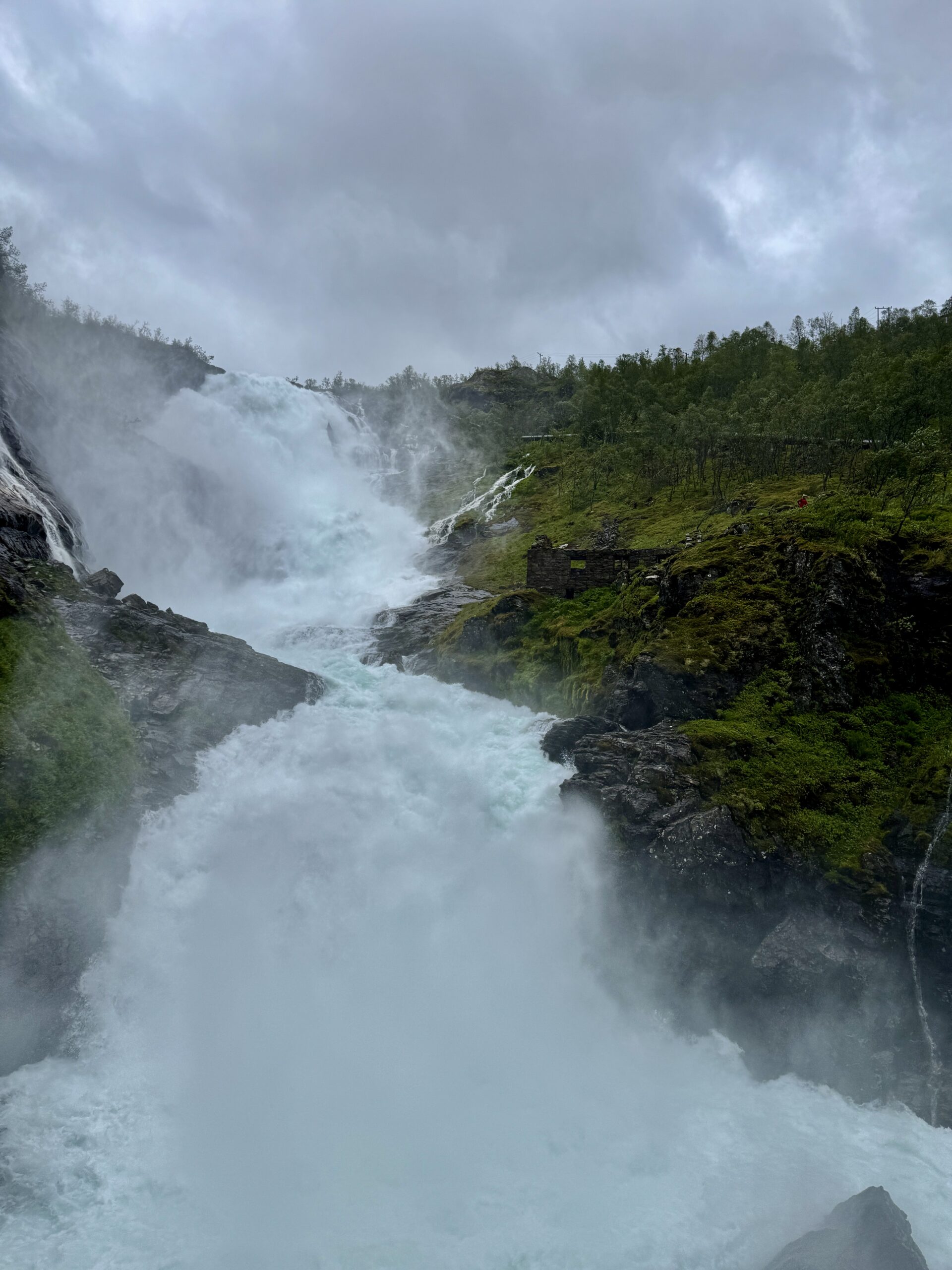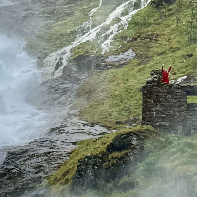 Then we boarded the antique train for Flåm. The Flam Railway – is widely recognized as one of the steepest and most beautiful railways in the world an it totally live up to the hype. From the large number of waterfalls to the deep valleys it was a spectacular trip. We stopped at one of the largest waterfalls to take pictures and they had music playing and a fairy dancing in the ruins at the top!! It was so surreal!!!